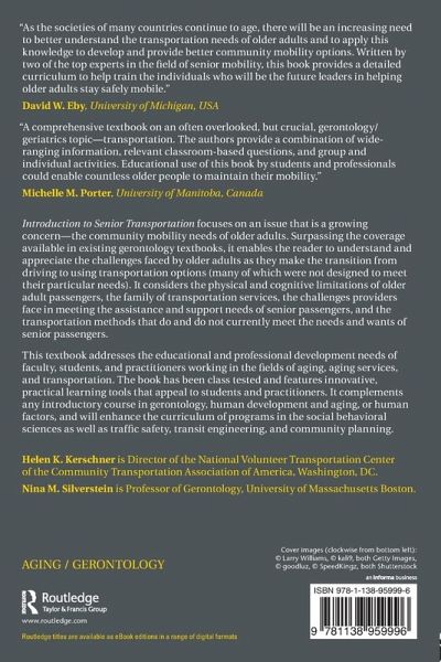 Introduction to Senior Transportation focuses on an issue that is a growing concern-the community mobility needs of older adults. Surpassing the coverage available in existing gerontology textbooks, it enables the reader to understand and appreciate the challenges faced by older adults as they make the transition from driving to using transportation options (many of which were not designed to meet their particular needs). It considers the physical and cognitive limitations of older adult passengers, the family of transportation services, the challenges providers face in meeting the assistance and support needs of senior passengers, and the transportation methods that do and do not currently meet the needs and wants of senior passengers.¿ This textbook addresses the educational and professional development needs of faculty, students, and practitioners working in the fields of aging, aging services, and transportation. The book has been class-tested and features innovative, practical learning tools that appeal to students and practitioners. It complements any introductory course in gerontology, human development and aging, or human factors, and will enhance the curriculum of programs in the social behavioral sciences as well as traffic safety, transit engineering, and community planning.
