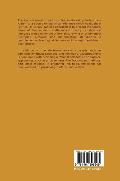 This book is based upon lecture notes developed by Jack Kiefer for a course in statistical inference he taught at Cornell University. The notes were distributed to the class in lieu of a textbook, and the problems were used for homework assignments. Relying only on modest prerequisites of probability theory and cal culus, Kiefer's approach to a first course in statistics is to present the central ideas of the modem mathematical theory with a minimum of fuss and formality. He is able to do this by using a rich mixture of examples, pictures, and math ematical derivations to complement a clear and logical discussion of the important ideas in plain English. The straightforwardness of Kiefer's presentation is remarkable in view of the sophistication and depth of his examination of the major theme: How should an intelligent person formulate a statistical problem and choose a statistical procedure to apply to it? Kiefer's view, in the same spirit as Neyman and Wald, is that one should try to assess the consequences of a statistical choice in some quan titative (frequentist) formulation and ought to choose a course of action that is verifiably optimal (or nearly so) without regard to the perceived "attractiveness" of certain dogmas and methods.