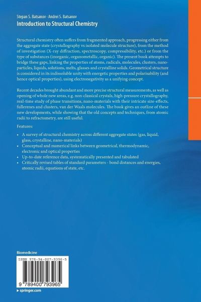 A concise description of models and quantitative parameters in structural chemistry and their interrelations, with 280 tables and >3000 references giving the most up-to-date experimental data on energy characteristics of atoms, molecules and crystals (ionisation potentials, electron affinities, bond energies, heats of phase transitions, band and lattice energies), optical properties (refractive index, polarisability), spectroscopic characteristics and geometrical parameters (bond distances and angles, coordination numbers) of substances in gaseous, liquid and solid states, in glasses and melts, for various thermodynamic conditions. Systems of metallic, covalent, ionic and van der Waals radii, effective atomic charges and other empirical and semi-empirical models are critically revised. Special attention is given to new and growing areas: structural studies of solids under high pressures and van der Waals molecules in gases. The book is addressed to researchers, academics, postgraduates and advanced-course students in crystallography, materials science, physical chemistry of solids.