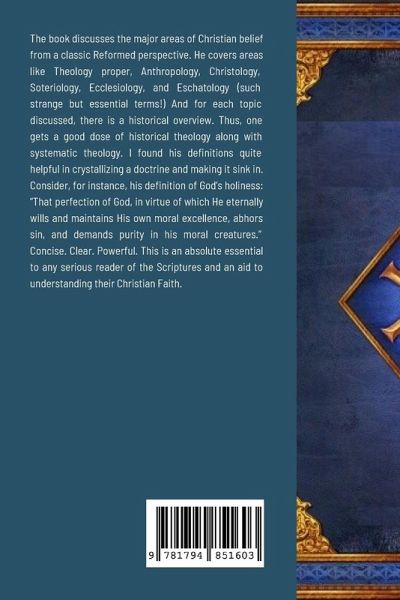 The book discusses the major areas of Christian belief from a classic Reformed perspective. He covers areas like Theology proper, Anthropology, Christology, Soteriology, Ecclesiology, and Eschatology (such strange but essential terms!) And for each topic discussed, there is a historical overview. Thus, one gets a good dose of historical theology along with systematic theology. I found his definitions quite helpful in crystallizing a doctrine and making it sink in. Consider, for instance, his definition of God's holiness: "That perfection of God, in virtue of which He eternally wills and maintains His own moral excellence, abhors sin, and demands purity in his moral creatures." Concise. Clear. Powerful. This is an absolute essential work for any serious student of the Scriptures and as a service guide to their Christian Faith.