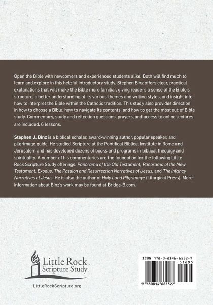 Open the Bible with newcomers and experienced students alike. Both will find much to learn and explore in this helpful introductory study. Stephen Binz offers clear, practical explanations that will make the Bible more familiar, giving readers a sense of the Bible's structure, a better understanding of its various themes and writing styles, and insight into how to interpret the Bible within the Catholic tradition. This study also provides direction in how to choose a Bible, how to navigate its contents, and how to get the most out of Bible study. Commentary, study and reflection questions, prayers, and access to online lectures are included. 6 lessons.