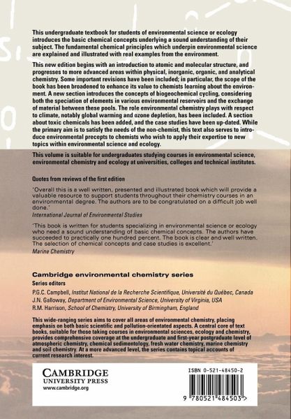 The new edition of this textbook introduces the basic chemical concepts underlying a sound understanding of environmental science and ecology. Fundamental chemical principles are explained and illustrated with real examples from the environment. From an introduction to atomic and molecular structure, the text progresses to more advanced areas within physical, inorganic, organic and analytical chemistry. Important new sections for this new edition include an introduction to the concepts of biogeochemical cycling, and the role environmental chemistry plays with respect to climate, notably global warming and ozone depletion. The case studies have been up-dated, and a section about toxic chemicals has been added. While the primary aim is to satisfy the needs of the non-chemist, the text also serves to introduce environmental precepts to chemists who wish to apply their expertise to environmental issues. This volume is especially suitable for undergraduates in environmental science, environmental chemistry and ecology at universities, colleges and technical institutes.