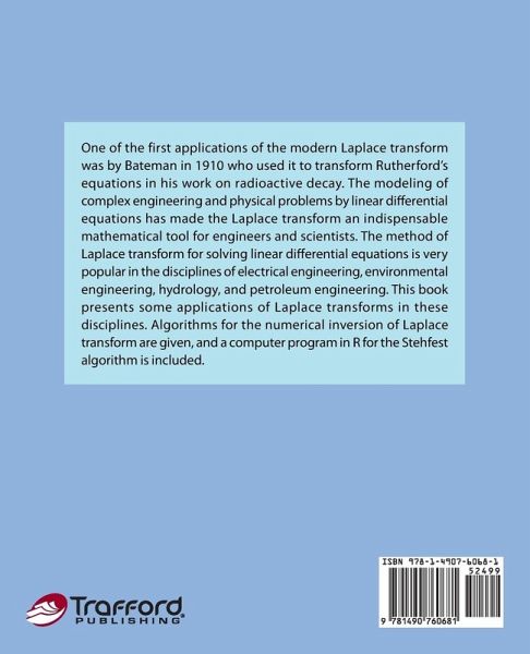 One of the first applications of the modern Laplace transform was by Bateman in 1910 who used it to transform Rutherford's equations in his work on radioactive decay. The modeling of complex engineering and physical problems by linear differential equations has made the Laplace transform an indispensable mathematical tool for engineers and scientists. The method of Laplace transform for solving linear differential equations is very popular in the disciplines of electrical engineering, environmental engineering, hydrology, and petroleum engineering. This book presents some applications of Laplace transforms in these disciplines. Algorithms for the numerical inversion of Laplace transform are given, and a computer program in R for the Stehfest algorithm is included.