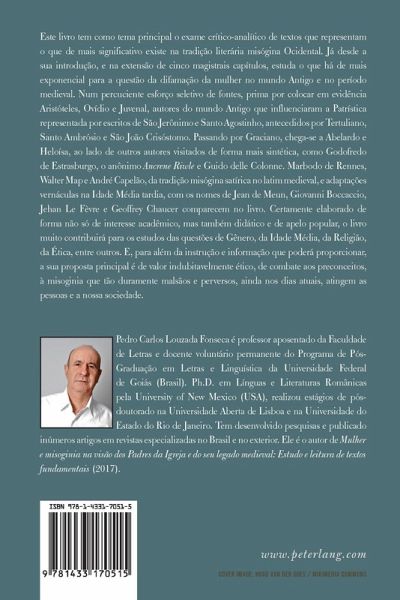 Este livro tem como tema principal o exame crítico-analítico de textos que representam o que de mais significativo existe na tradição literária misógina Ocidental. Já desde a sua introdução, e na extensão de cinco magistrais capítulos, estuda o que há de mais exponencial para a questão da difamação da mulher no mundo Antigo e no período medieval. Num percuciente esforço seletivo de fontes, prima por colocar em evidência Aristóteles, Ovídio e Juvenal, autores do mundo Antigo que influenciaram a Patrística representada por escritos de São Jerônimo e Santo Agostinho, antecedidos por Tertuliano, Santo Ambrósio e São João Crisóstomo. Passando por Graciano, chega-se a Abelardo e Heloísa, ao lado de outros autores visitados de forma mais sintética, como Godofredo de Estrasburgo, o anônimo Ancrene Riwle e Guido delle Colonne. Marbodo de Rennes, Walter Map e André Capelão, da tradição misógina satírica no latim medieval, e adaptações vernáculas na Idade Média tardia, com os nomes de Jean de Meun, Giovanni Boccaccio, Jehan Le Fèvre e Geoffrey Chaucer comparecem no livro. Certamente elaborado de forma não só de interesse acadêmico, mas também didático e de apelo popular, o livro muito contribuirá para os estudos das questões de Gênero, da Idade Média, da Religião, da Ética, entre outros. E, para além da instrução e informação que poderá proporcionar, a sua proposta principal é de valor indubitavelmente ético, de combate aos preconceitos, à misoginia que tão duramente malsãos e perversos, ainda nos dias atuais, atingem as pessoas e a nossa sociedade.