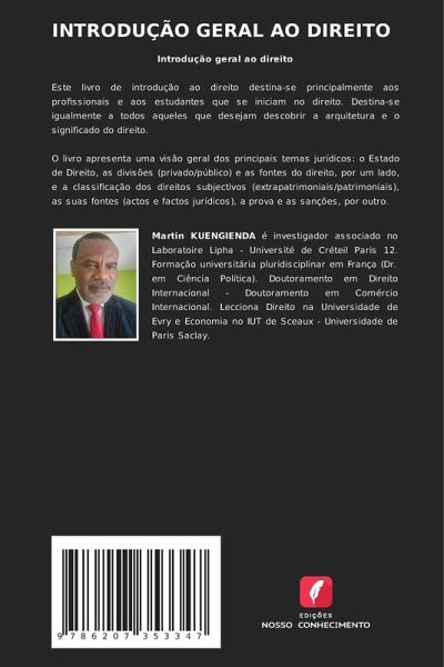 Introdução geral ao direitoEste livro de introdução ao direito destina-se principalmente aos profissionais e aos estudantes que se iniciam no direito. Destina-se igualmente a todos aqueles que desejam descobrir a arquitetura e o significado do direito.O livro apresenta uma visão geral dos principais temas jurídicos: o Estado de Direito, as divisões (privado/público) e as fontes do direito, por um lado, e a classificação dos direitos subjectivos (extrapatrimoniais/patrimoniais), as suas fontes (actos e factos jurídicos), a prova e as sanções, por outro.