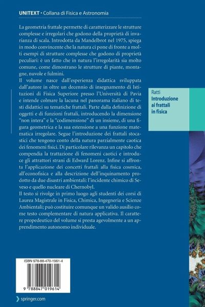 Il volume nasce dall'esperienza didattica sviluppata dall'autore in oltre un decennio di insegnamento di Istituzioni di Fisica Superiore presso l'Università di Pavia e intende colmare la lacuna nel panorama italiano di testi didattici su tematiche frattali. Parte dalla definizione di oggetti e di funzioni frattali, introducendo la dimensione "non intera" e la "codimensione" di un insieme, di una figura geometrica e la sua estensione a una funzione matematica irregolare. Segue l'introduzione dei frattali stocastici (fino ai frattali universali) che tengono nel dovuto conto la natura parzialmente caotica dei fenomeni fisici. Di particolare rilevanza un capitolo che compendia la trattazione di fenomeni caotici e introduce gli attrattori strani di Edward Lorenz. Infine il volume affronta l'applicazione dei concetti frattali alla fisica cosmica, all'econofisica e alla descrizione dell'inquinamento prodotto da due disastri ambientali: l'incidente chimico di Seveso e quello nucleare di Chernobyl.