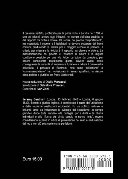 Il presente trattato, pubblicato per la prima volta a Londra nel 1780, è uno dei pilastri, ancora oggi influenti, nel campo dell'etica pubblica e del rapporto tra diritto e morale. Gli uomini, col proprio comportamento, ma soprattutto i governi e i legislatori, si devono occupare del bene comune producendo la felicità per il maggior numero di persone. Il criterio per misurare la felicità è il rapporto tra piacere e dolore. La massimizzazione del piacere e l'assenza di dolore è la miglior condizione possibile per una vita felice. Le azioni da compiere, per essere considerate moralmente giuste, devono avere come conseguenza la capacità di aumentare il piacere e ridurre il dolore nella collettività. Il pensiero di Bentham, noto come "utilitarismo" o "consequenzialismo", ha rivoluzionato in senso egualitario la visione etica, politica e giuridica dei Paesi Occidentali. Nuova traduzione di Otello Marcacci. Introduzione di Salvatore Primiceri.