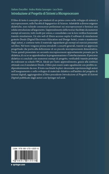 Il libro di testo è concepito per studenti di un primo corso sullo sviluppo di sistemi a microprocessore, nelle Facoltà di Ingegneria e di Scienze. Adattabile a diverse esigenze didattiche, non richiede conoscenze preliminari sui microprocessori e fornisce una solida introduzione all'argomento. L'apprendimento della teoria è facilitato da numerosi esempi ed esercizi, tutti risolti per esteso, e consolidato con la loro verifica funzionale tramite simulazione. Un sito web di libero accesso ospita il software di simulazione gratuito Deeds (Digital Electronics Education and Design Suite), creato e mantenuto dagli autori, e contiene tutto il materiale riguardante gli esempi ed esercizi presentati nel libro. Nel testo vengono prima introdotti i concetti generali, tramite un approccio progettuale che porta alla definizione di un piccolo microprocessore dimostrativo. Viene quindi presentato un secondo microprocessore appositamente pensato per la didattica, di cui se ne approfondisce la programmazione e l'interfacciamento. Il percorso didattico si conclude con numerosi esempi di progetto, verificabili tramite prototipi da realizzare su schede FPGA. Ideale per l'auto-apprendimento, grazie alla simbiosi ottimale con il simulatore Deeds, il libro può essere usato ugualmente con profitto indipendentemente da esso. Il testo racchiude la pluri-decennale esperienza degli autori nell'insegnamento e nello sviluppo di materiale didattico nell'ambito del progetto di sistemi digitali, aggiungendosi al libro precedente "Introduzione al Progetto di Sistemi Digitali" pubblicato dagli autori con Springer nel 2018.