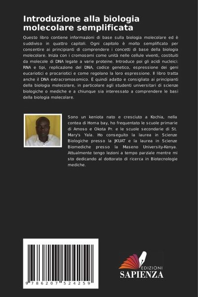 Questo libro contiene informazioni di base sulla biologia molecolare ed è suddiviso in quattro capitoli. Ogni capitolo è molto semplificato per consentire ai principianti di comprendere i concetti di base della biologia molecolare. Inizia con i cromosomi come unità nelle cellule viventi, costituiti da molecole di DNA legate a varie proteine. Introduce poi gli acidi nucleici: RNA e tipi, replicazione del DNA, codice genetico, espressione dei geni eucariotici e procariotici e come regolano la loro espressione. Il libro tratta anche il DNA extracromosomico. È quindi adatto e consigliato ai principianti della biologia molecolare, in particolare agli studenti universitari di scienze biologiche o mediche e a chiunque sia interessato a comprendere le basi della biologia molecolare.