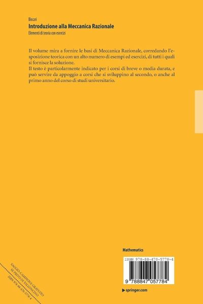 Il libro mira a fornire le basi di Meccanica Razionale, corredando l'esposizione teorica con un alto numero di esempi ed esercizi, di tutti i quali si fornisce la soluzione. Il testo è particolarmente indicato per i corsi di breve o media durata, e può servire da appoggio a corsi che si sviluppino al secondo, o anche al primo anno del corso di studi universitario.