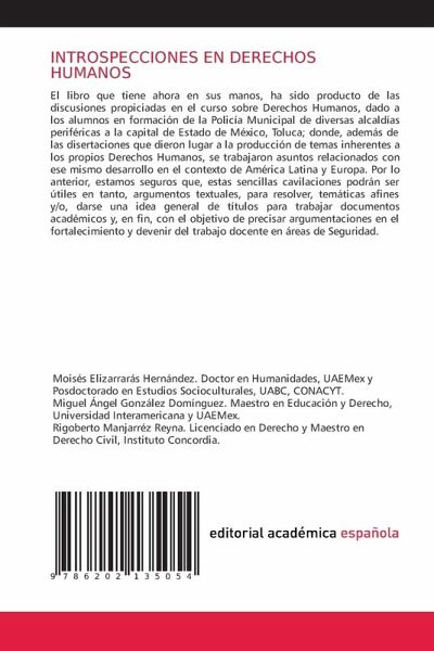 El libro que tiene ahora en sus manos, ha sido producto de las discusiones propiciadas en el curso sobre Derechos Humanos, dado a los alumnos en formación de la Policía Municipal de diversas alcaldías periféricas a la capital de Estado de México, Toluca; donde, además de las disertaciones que dieron lugar a la producción de temas inherentes a los propios Derechos Humanos, se trabajaron asuntos relacionados con ese mismo desarrollo en el contexto de América Latina y Europa. Por lo anterior, estamos seguros que, estas sencillas cavilaciones podrán ser útiles en tanto, argumentos textuales, para resolver, temáticas afines y/o, darse una idea general de títulos para trabajar documentos académicos y, en fin, con el objetivo de precisar argumentaciones en el fortalecimiento y devenir del trabajo docente en áreas de Seguridad.