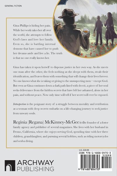 Gina Phillips is hiding her pain. While her work takes her all over the world, she attempts to follow God's laws and love her family. Even so, she is battling internal demons that have caused her to push her dreams aside and live a lie. The truth is that no one really knows her. Gina has taken it upon herself to dispense justice in her own way. As she meets one man after the other, she feels nothing as she sleeps with them, steals their identification, and leaves them with something that will change their lives forever. No one knows what she is taking or giving to the unsuspecting men-except God. But even as Gina continues down a dark path lined with deceit, a piece of her soul seeks deliverance from the hidden secrets that have left her ashamed, alone in her pain, and without peace. Now only time will tell if her secret will ever be exposed. Introspection is the poignant story of a struggle between morality and retribution as a woman with deep secrets embarks on a life-changing journey to seek justice from unwary souls.
