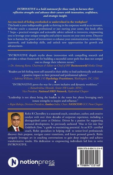 INTROVATIVE is a bold statement for those ready to harness their reflective strengths and advance their careers with innovation, confidence, and strategic insight. Are you tired of feeling overlooked or undervalued in the workplace? This book is your indispensable guide to thriving in the corporate world as an introvert. Whether you're a seasoned professional or just starting your career, this book offers 7 Steps - practical strategies and actionable advice tailored to introverts, empowering you to leverage your unique strengths and achieve success on your own terms. Discover how to harness the power of introversion to enhance your communication, networking, teamwork, and leadership skills, and unlock new opportunities for growth and advancement. "INTROVATIVE dispels myths about introversion with compelling research and provides a robust framework for building a successful career path that does not compel one to change their inherent nature.'' - Dr. Annurag Batra, Chairman & Editor in Chief of BW Businessworld Media Group "Readers are left feeling more self-assured in their ability to lead authentically and create a positive impact in their personal and professional spheres." - Sabrina Williams, MPS, I-O Psychology Practitioner, Washington, DC, USA "INTROVATIVE paves the way for a more inclusive and dynamic workforce." - Ramakrishna Momidi, Senior HR Leader, MNC; Vice President, National HRD Network, Hyderabad Chapter "Leadership is not about being the loudest in the room but about leveraging one's innate strengths to inspire and influence." - Rajat Raheja, Division President, Amdocs India; Chair, NASSCOM GCC Pune Chapter