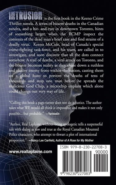 A unique and perfect blend of crime, thrills, geopolitical intrigue and action, the Keeno Crime Thrillers follow Keeno McCole - who heads up the ATU or Anti-Terrorism-Unit of the Royal Canadian Mounted Police, together with his crime-fighting partner, Jake Williams, and the think-tank and forensic sharpshooters, Janene and Kelly, this four man team takes on major players in the criminal arena. Their exploits and chases take them from Canada to lands across the world as they pursue the perpetrators of crimes ranging from viral attacks, human trafficking and even into Ukraine and Russia as they chase down a vigilante group targeting Vladimir Putin. McCole, a mix of native Indian, Irish and French, is no stranger to pain and he accepts his constant dance with the grim-reaper, evading death but not without his share of bleeding. Take a ride with this high-octane, high-concept crime and geopolitical thriller series. You will come to love Keeno McCole. Intrusion: (Book I) Keeno and his team are faced with a domestic terrorist intent on crashing the Canadian economy with a viral attack, but the true motive is only revealed when they follow the trail of death and discover a morbid agenda that will change the world. Intrusion: Book I Quantum Assault: Book II The One: Book III The 9th Divinity: Book IV "Calling this book a page-turner does not do it justice. The author takes what WE would all think is impossible and makes it not only possible....but probable." - Yankeelin "Author, Real Laplaine, without being apologetic tells a suspenseful tale with dialog as raw and true as the Royal Canadian Mounted Police characters, who attempt to thwart a plot of international proportion." - Nancy Lee Canfield, Author of A Rose for My Mother