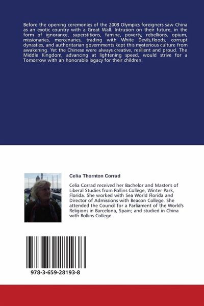 Before the opening ceremonies of the 2008 Olympics foreigners saw China as an exotic country with a Great Wall. Intrusion on their future, in the form of ignorance, superstitions, famine, poverty, rebellions, opium, missionaries, mercenaries, trading with White Devils,floods, corrupt dynasties, and authoritarian governments kept this mysterious culture from awakening. Yet the Chinese were always creative, resilient and proud. The Middle Kingdom, advancing at lightening speed, would strive for a Tomorrow with an honorable legacy for their children.