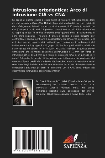Lo scopo di questo studio è stato quello di valutare l'efficacia clinica degli archi di intrusione CIA e CNA. Metodi: Sono stati analizzati i tracciati registrati dai cefalogrammi laterali pre e post-trattamento di 25 pazienti trattati con CIA (Gruppo I) e di altri 25 pazienti trattati con archi di intrusione CNA (Gruppo II) in casi di morso profondo dopo quattro mesi di trattamento e sono stati registrati i risultati. Il t-test a coppie è stato utilizzato per confrontare i cambiamenti pre e post-trattamento all'interno dei gruppi I e II e il t-test non a coppie è stato utilizzato per confrontare i cambiamenti del trattamento tra il gruppo I e il gruppo II. Per la significatività statistica è stato fissato un valore "P" di < 0,05. Risultati: I risultati di questo studio dimostrano che in media si verifica un'intrusione di 1 mm con l'arco di intrusione CIA e di 1,3 mm con l'arco di intrusione CNA in un periodo di 4 mesi. Entrambe le arcate di intrusione non influenzano la posizione del molare sul piano verticale o anteroposteriore. Anche se si osserva una certa retrazione degli incisivi inferiori con entrambe le arcate. Interpretazione e conclusioni: Entrambi gli archi di intrusione CIA e CNA sono efficaci nel determinare l'intrusione degli incisivi inferiori.