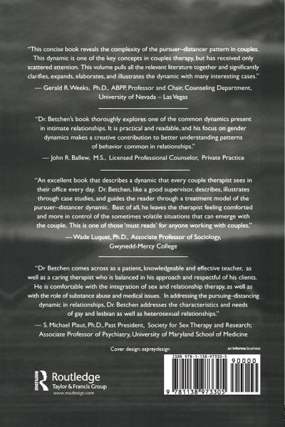 Preface. Acknowledgements. Introduction: Understanding the Pursuer-Distancer Dynamic. Traits and Tendencies of the Pursuer and the Distancer. Gender Roles and the Pursuer Distancer Dynamic. Biological Determinants. Societal Influences and Changing Gender Roles. Familial Influences. Family of Origin: The Emotional and Psychological. Development of Pursuers and Distancers. Female Pursuers. Male Distancers. Male Pursuers. Female Distancers. Treatment Model. Assessment. Mode and Frequency of Treatment. Joining. Encouraging Individual Responsibility. Constructing the Genogram. Uncovering Conflicts and Faciliatating Differentiation. Labeling. Assigned Readings. Balancing Content and Process. The Question of Intimacy. The Role of Medication. Transference and Countertransference. Termination. Evaluating Sexual Dysfunction in the Pursuer-Distancer Dynamic. Sex: A Common Context for the Pursuer-Distancer Dynamic. Integrating Sex and Couples Therapy. Taking a Sexual History: The Sexual Genogram. Male Sexual Disorders and the Pursuer-Distancer Dynamic. Male Erectile Disorder. Premature Ejaculation. Male Orgasmic Disorder. Female Sexual Disorders and the Pursuer-Distancer Dynamic. Female Orgasmic Disorder. Vaginismus (Pelvic Floor Muscle Pain) Hypoactive Sexual Desire Disorder and the Pursuer-Distancer Dynamic. Same-sex Couples and the Pursuer-Distancer Dynamic. Discrimination and Homophobia. Roles and Relationship Fluidity. Relationship Commitment. Fusion, Sexual Desire, and the So-called 'Lesbian Bed Death' Concept. Therapist Bias. Difficult Cases and Case Failure. Triangulated Children. Death and Distancing. When One Partner has Attention-Deficit/Hyperactivity Disorder. In Pursuit of Marriage. The Ultimate Distancer. No Sexual Attraction, No Sexual Desire. Other Contexts and the Pursuer-Distancer Dynamic. Intimate Partner Violence. Employment (Work). Infidelity (Affairs). Alcohol Dependence and Abuse. Epilogue. References. Index.
