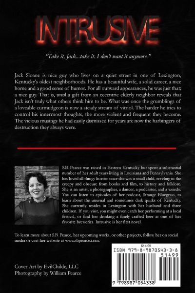 Jack Sloane is a nice guy who lives on a quiet street in one of Lexington, Kentucky's oldest neighborhoods. He has a beautiful wife, a solid career, a nice home and decent sense of humor. For all outward appearances, he was just that. A nice guy. That is, until a gift from an eccentric elderly neighbor reveals that Jack isn't truly what others think him to be. ¿ What was once the grumblings of a lovable curmudgeon is now a steady stream of vitriol. The harder he tries to control his innermost thoughts, the more violent and frequent they become. The vicious musings he had easily dismissed for years are now the harbingers of destruction they always were. Intrusive is the debut novel by Kentucky horror author and poet, S.B. Pearce.