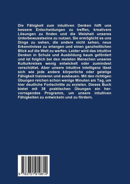 Die Fähigkeit zum intuitiven Denken hilft uns bessere Entscheidungen zu treffen, kreativere Lösungen zu finden und die Weisheit unseres Unterbewusstseins zu nutzen. Sie ermöglicht es uns Dinge zu sehen, die andere nicht sehen, neue Erkenntnisse zu erlangen und einen ganzheitlichen Blick auf die Welt zu werfen. Leider wird das intuitive Denken in Schule und Ausbildung kaum gefördert und ist folglich bei den meisten Menschen unseres Kulturkreises wenig entwickelt oder zumindest verschüttet. Aber unsere intuitive Intelligenz lässt sich wie jede andere körperliche oder geistige Fähigkeit trainieren und ausbauen. Mit den richtigen Übungen reichen schon wenige Minuten am Tag, um hier deutliche Fortschritte zu erzielen. Dieses Buch bietet mit 38 praktischen Übungen ein hervorragendes Programm, um unsere intuitiven Fähigkeiten zu entwickeln und zu fördern.