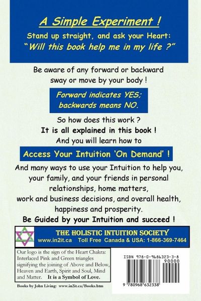 A Simple Experiment ! Stand up straight, and ask your Heart: "Will this book help me in my life ?" Be aware of any forward or backward sway or move by your body ! Forward indicates YES; backwards means NO. So how does this work ? It is all explained in this book ! You will learn how to Access Your Intuition 'On Demand', and many ways to use your Intuition to help you, your family, and your friends in personal relationships, home matters,work and business decisions, and overall health, happiness and prosperity. Be Guided by your Intuition and succeed !