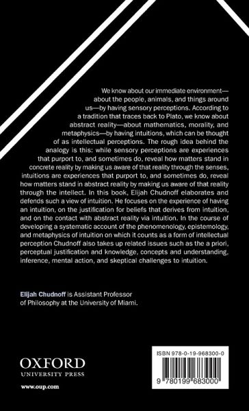 We know about our immediate environment--about the people, animals, and things around us--by having sensory perceptions. According to a tradition that traces back to Plato, we know about abstract reality--about mathematics, morality, and metaphysics--by having intuitions, which can be thought of as intellectual perceptions. The rough idea behind the analogy is this: while sensory perceptions are experiences that purport to, and sometimes do, reveal how matters stand in concrete reality by making us aware of that reality through the senses, intuitions are experiences that purport to, and sometimes do, reveal how matters stand in abstract reality by making us aware of that reality through the intellect. In this book, Elijah Chudnoff elaborates and defends such a view of intuition. He focuses on the experience of having an intuition, on the justification for beliefs that derives from intuition, and on the contact with abstract reality via intuition. In the course of developing a systematic account of the phenomenology, epistemology, and metaphysics of intuition on which it counts as a form of intellectual perception Chudnoff also takes up related issues such as the a priori, perceptual justification and knowledge, concepts and understanding, inference, mental action, and skeptical challenges to intuition.