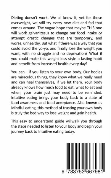 Dieting doesn't work. We all know it, yet for those overweight, we still try every new diet and fad that comes around. The vague hope that maybe THIS one will work galvanizes us to change our food intake or attempt drastic changes that are temporary, and worse, unhealthy. But what if there was a way that you could avoid the yo-yo, and finally lose the weight you want, with no struggle and no deprivation? What if you could make this weight loss style a lasting habit and benefit from increased health every day?You can... if you listen to your own body. Our bodies are miraculous things, they know what we really need and can heal themselves, if we let them. Your body already knows how much food to eat, what to eat and when, your brain just may need to be reminded. Intuitive eating brings your body back to a state of food awareness and food acceptance. Also known as Mindful eating, this method of trusting your own body is truly the bed way to lose weight and gain health.This easy to understand guide will walk you through the steps needed to listen to your body and begin your journey back to Intuitive eating today.
