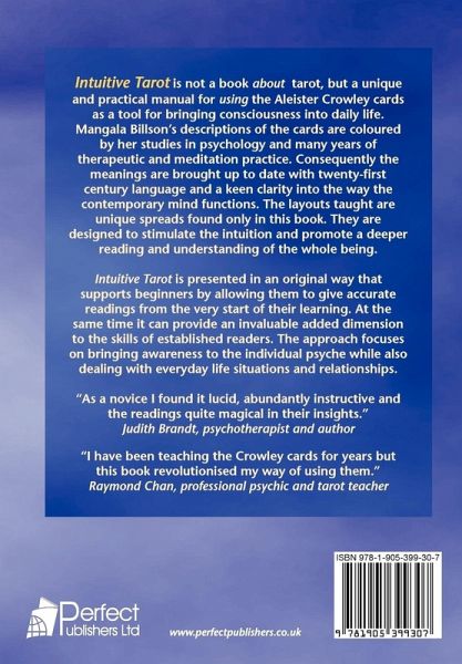 Intuitive Tarot, tools for consciousness, is not a book about tarot, but a unique and practical manual for using the Aleister Crowley cards as a tool for bringing consciousness into daily life. Mangala Billson's descriptions of the cards are coloured by her studies in psychology and many years of therapeutic and meditation practice. Consequently the meanings are brought up to date with twenty-first century language and a keen clarity into the way the contemporary mind functions. The layouts taught are unique spreads found only in this book. They are designed to stimulate the intuition and promote a deeper reading and understanding of the whole being. Intuitive Tarot is presented in an original way that supports beginners by allowing them to give accurate readings from the very start of their learning. At the same time it can provide an invaluable added dimension to the skills of established readers. The approach focuses on bringing awareness to the individual psyche while also dealing with everyday life situations and relationships.