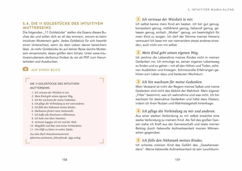 Die natürliche Verbindung zu sich selbst und zum Kind wiederherzustellen, Vertrauen und Selbstbewusstsein zurück zu gewinnen, ist deshalb ein Ziel, das die meisten Frauen in unserer Gesellschaft eint. Die Autorin Karima Stockmann ist zertifizierte Stressmanagement-Trainerin und sagt: "Jede Frau kann ihre Intuition reaktivieren und sich selbst wieder mehr vertrauen." Ihr Buch bietet
