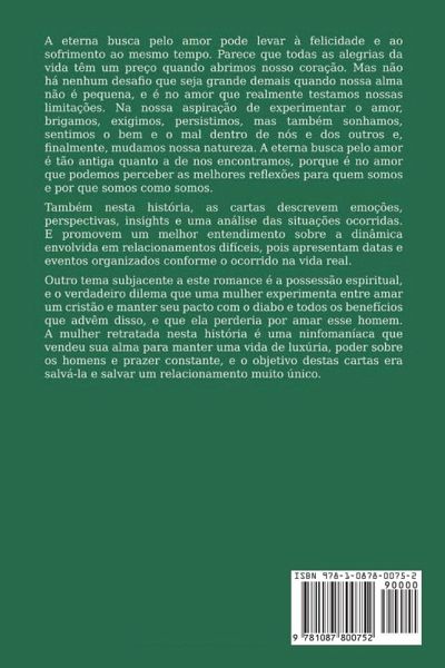 A eterna busca pelo amor pode levar à felicidade e ao sofrimento ao mesmo tempo. Parece que todas as alegrias da vida têm um preço quando abrimos nosso coração. Mas não há nenhum desafio que seja grande demais quando nossa alma não é pequena, e é no amor que realmente testamos nossas limitações. Na nossa aspiração de experimentar o amor, brigamos, exigimos, persistimos, mas também sonhamos, sentimos o bem e o mal dentro de nós e dos outros e, finalmente, mudamos nossa natureza. A eterna busca pelo amor é tão antiga quanto a de nos encontramos, porque é no amor que podemos perceber as melhores reflexões para quem somos e por que somos como somos. Também nesta história, as cartas descrevem emoções, perspectivas, insights e uma análise das situações ocorridas. E promovem um melhor entendimento sobre a dinâmica envolvida em relacionamentos difíceis, pois apresentam datas e eventos organizados conforme o ocorrido na vida real. Outro tema subjacente a este romance é a possessão espiritual, e o verdadeiro dilema que uma mulher experimenta entre amar um cristão e manter seu pacto com o diabo e todos os benefícios que advêm disso, e que ela perderia por amar esse homem. A mulher retratada nesta história é uma ninfomaníaca que vendeu sua alma para manter uma vida de luxúria, poder sobre os homens e prazer constante, e o objetivo destas cartas era salvá-la e salvar um relacionamento muito único.