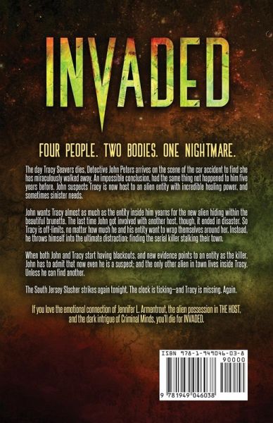 Four people. Two bodies. One nightmare. The day Tracy Seavers dies, Detective John Peters arrives on the scene of the car accident to find she has miraculously walked away. An impossible conclusion, had the same thing not happened to him five years before. John suspects Tracy is now host to an alien entity with incredible healing power, and sometimes sinister needs. John wants Tracy almost as much as the entity inside him yearns for the new alien hiding within the beautiful brunette. The last time John got involved with another host, though, it ended in disaster. So Tracy is off-limits, no matter how much he and his entity want to wrap themselves around her. Instead, he throws himself into the ultimate distraction: finding the serial killer stalking their town. When both John and Tracy start having blackouts, and new evidence points to an entity as the killer, John has to admit that now even he is a suspect; and the only other alien in town lives inside Tracy. Unless he can find another. The South Jersey Slasher strikes again tonight. The clock is ticking-and Tracy is missing. Again. If you love the emotional connection of Jennifer L. Armentrout, the alien possession in THE HOST, and the dark intrigue of Criminal Minds, you'll die for INVADED. Buy INVADED today and get ready to catch a killer.