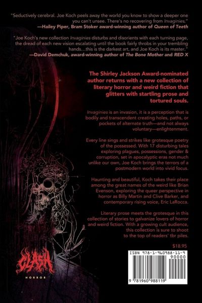 The Shirley Jackson Award-nominated author returns with a new collection of literary horror and weird fiction that glitters with startling prose and tortured souls. Invaginies is an invasion, it is a perception that is bodily and transcendent creating holes, paths, or pockets of alternate truth-and not always voluntary?enlightenment. Every line sings and strikes like grotesque poetry of the possessed. With 17 disturbing tales exploring plagues, possessions, gender & corruption, set in apocalyptic eras not much unlike our own, Joe Koch brings the terrors of a postmodern world into vivid focus. Haunting and beautiful, Koch takes their place among the great names of the weird like Brian Evenson, exploring the queer perspective in horror as Billy Martin and Clive Barker, and contemporary rising voice, Eric LaRocca. Literary prose meets the grotesque in this collection of stories to galvanize lovers of horror and weird fiction. With a growing cult audience, this collection is sure to shoot to the top of readers' tbr piles.