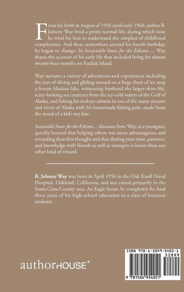 From his birth in August of 1956 until early 1960, author B. Johnny Way lived a pretty normal life, during which time he tried his best to understand the simplest of childhood complexities. And then, somewhere around his fourth birthday, he began to change. In Invariable Snow for the Eskimo..., Way shares the account of his early life that included living for almost twenty-four months on Kodiak Island. Way narrates a variety of adventures and experiences including the joys of slicing and gliding around on a huge sheet of ice atop a frozen Alaskan lake, witnessing firsthand the larger-than-life, scary-looking sea creatures from the icy-cold waters of the Gulf of Alaska, and fishing for sockeye salmon in one of the many streams and rivers of Alaska with his homemade fishing pole, made from the wood of a kid's toy kite. Invariable Snow for the Eskimo... discusses how, Way, as a youngster, quickly learned that helping others was more advantageous and rewarding than first thought and that sharing your time, patience, and knowledge with friends as well as strangers is better than any other kind of reward.