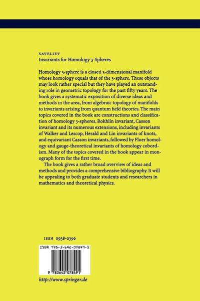"As suggested by the title of the book, its main subject are invariants of integer and rational homology 3-spheres ... . The book is written in a style in the middle between the text book and a report or encyclopaedia. ... on little more than 200 pages the book presents a wealth of material which will make it useful for graduate students and researchers in mathematics and theoretical physics looking for information and orientation in a field of considerable interest in the last decades."