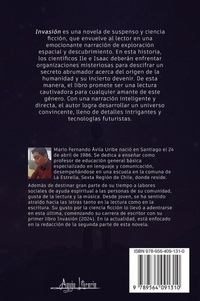 Invasión es una novela de suspenso y ciencia ficción, que envuelve al lector en una emocionante narración de exploración espacial y descubrimiento. En esta historia, los científicos Ile e Isaac deberán enfrentar organizaciones misteriosas para descifrar un secreto abrumador acerca del origen de la humanidad y su incierto devenir. De esta manera, el libro promete ser una lectura cautivadora para cualquier amante de este género. Con una narración inteligente y directa, el autor logra desarrollar un universo convincente, lleno de detalles intrigantes y tecnologías futuristas.