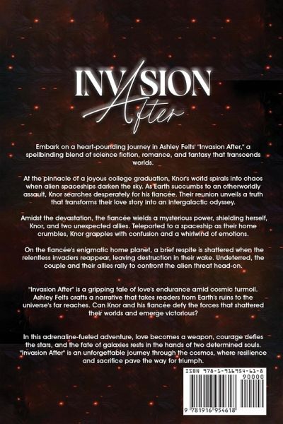 ¿Embark on a heart-pounding journey in Ashley Felts' "Invasion After," a spellbinding blend of science fiction, romance, and fantasy that transcends worlds. At the pinnacle of a joyous college graduation, Knor's world spirals into chaos when alien spaceships darken the sky. As Earth succumbs to an otherworldly assault, Knor searches desperately for his fiancée. Their reunion unveils a truth that transforms their love story into an intergalactic odyssey. Amidst the devastation, the fiancée wields a mysterious power, shielding herself, Knor, and two unexpected allies. Teleported to a spaceship as their home crumbles, Knor grapples with confusion and a whirlwind of emotions. On the fiancée's enigmatic home planet, a brief respite is shattered when the relentless invaders reappear, leaving destruction in their wake. Undeterred, the couple and their allies rally to confront the alien threat head-on. "Invasion After" is a gripping tale of love's endurance amid cosmic turmoil. Ashley Felts crafts a narrative that takes readers from Earth's ruins to the universe's far reaches. Can Knor and his fiancée defy the forces that shattered their worlds and emerge victorious? In this adrenaline-fueled adventure, love becomes a weapon, courage defies the stars, and the fate of galaxies rests in the hands of two determined souls. "Invasion After" is an unforgettable journey through the cosmos, where resilience and sacrifice pave the way for triumph.