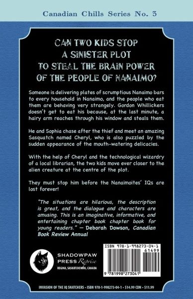 Can two kids stop a sinister plot to steal the brain power of the people of Nanaimo? Someone is delivering plates of scrumptious Nanaimo bars to every household in Nanaimo, and the people who eat them are behaving very strangely. Gordon Whillickers doesn't get to eat his because, at the last minute, a hairy arm reaches through his window and steals them. He and Sophia chase after the thief and meet an amazing Sasquatch named Cheryl, who is also puzzled by the sudden appearance of the mouth-watering delicacies. With the help of Cheryl and the technological wizardry of a local librarian, the two kids move ever closer to the alien creature at the centre of the plot. They must stop him before the Nanaimoites' IQs are lost forever!