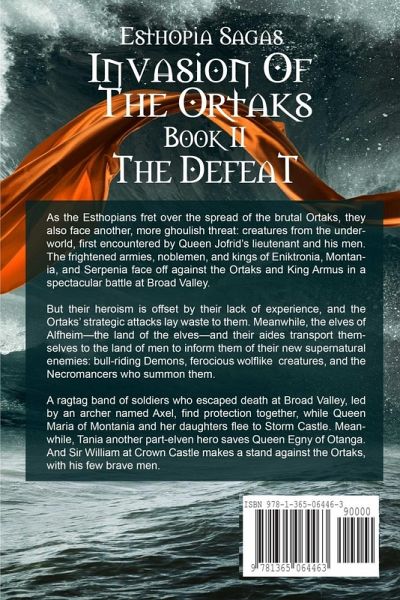 As the Esthopians fret over the spread of the brutal Ortaks, they also face another, more ghoulish threat: creatures from the underworld, first encountered by Queen Jofrid's lieutenant and his men. The frightened armies, noblemen, and kings of Eniktronia, Montania, and Serpenia face off against the Ortaks and King Armus in a spectacular battle at Broad Valley. But their heroism is offset by their lack of experience, and the Ortaks' strategic attacks lay waste to them. A ragtag band of soldiers who escaped death at Broad Valley, led by an archer named Axel, find protection together, while Queen Maria of Montania and her daughters flee to Storm Castle. Meanwhile, Tania another part-Elven hero saves Queen Egny of Otanga. And Sir William at Crown Castle makes a stand against the Ortaks, with his few brave men.