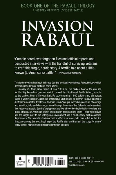 "The riveting first book in Bruce Gamble's critically acclaimed Rabaul trilogy, originally published in hardcover as Darkest Hour, which chronicles the longest battle of World War II. January 23, 1942, New Britain. It was 2:30 a.m., the darkest hour of the day and, for the tiny Australian garrison sent to defend this Southwest Pacific island, soon to be the darkest hour of the war. Lark Force, comprising 1,500 soldiers and six nurses, faced a vastly superior Japanese amphibious unit poised to overrun Rabaul, capital of Australia's mandated territories. Invasion Rabaul, the first book in military historian Bruce Gamble's critically acclaimed Rabaul trilogy, is a gut-wrenching account of courage and sacrifice, folly and disaster, as seen through the eyes of the defenders who survived the Japanese assault. Gamble's gripping narrative follows key individuals--soldiers and junior officers, an American citizen and an Army nurse among them--who were driven into the jungle, prey to the unforgiving environment and a cruel enemy that massacred its prisoners. The dramatic stories of the Lark Force survivors, told here in full for the first time, are among the most inspiring of the Pacific War--and they lay a triumphant foundation for one of today's most highly praised military nonfiction trilogies"--