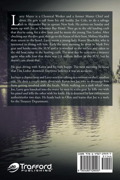 Larry Mayer is a Chemical Worker and a former Master Chief and diver. He gets a call from his old buddy, Joe Cole, to do a salvage job in Alexander Bay in upstate New York. He arrives on Sunday and meets up with Joe at Schooner Bay Hotel. They go to the old landing craft that they're using for a dive boat and he meets the young Tim Lesher. After checking out the dive gear, they go to the house of their host, Melissa Macklin then return to the hotel. Larry meets a young lady, Karen Shachtler, who is interested in diving wih him. Early the next morning he dives in Mark Five gear and hooks onto the SUV and it is winched to the surface and taken to the old boat ramp in the landing craft. The next day he runs into a treasury agent who tells him that there was 2.8 million dollars in the SUV, but he doesn't care about that. He goes diving with Karen and he feels happy. The next morning he hears that Tim Lesher drowned. Everyone believes it was an accident. Joe buys a charter boat and Larry sees him talking to a woman on the Canadian side. He does a couple more dives with Karen but Joe tries to discouage him from getting involved with the locals. While walking on a dark wharf with Joe, Larry gets knocked into the water by men in scuba gear. he kills one with his pistol and kills the other with his knife. He is detained by law enforement authoritiesfor two days. He heads back to Ohio and learns that Joe is a mole for the Treasury Department.
