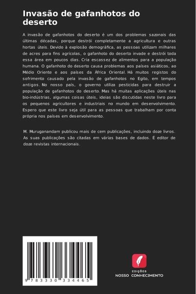 A invasão de gafanhotos do deserto é um dos problemas sazonais das últimas décadas, porque destrói completamente a agricultura e outras hortas úteis. Devido à explosão demográfica, as pessoas utilizam milhares de acres para fins agrícolas, o gafanhoto do deserto invade e destrói toda essa área em poucos dias. Cria escassez de alimentos para a população humana. O gafanhoto do deserto causa problemas aos países asiáticos, ao Médio Oriente e aos países da África Oriental. Há muitos registos do sofrimento causado pela invasão de gafanhotos no Egito, em tempos antigos. No nosso país, o governo utiliza pesticidas para destruir a população de gafanhotos do deserto. Mas há muitas aplicações úteis nas bio-indústrias, algumas coisas úteis, ideias são discutidas neste livro para os pequenos agricultores e industriais no mundo em desenvolvimento. Espero que este livro seja útil para as pessoas que trabalham por conta própria nos países em desenvolvimento.