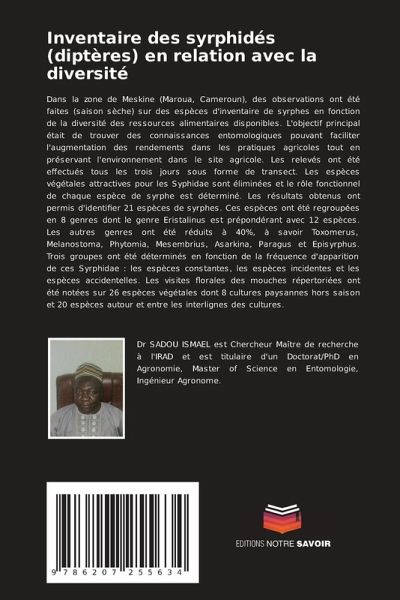 Dans la zone de Meskine (Maroua, Cameroun), des observations ont été faites (saison sèche) sur des espèces d'inventaire de syrphes en fonction de la diversité des ressources alimentaires disponibles. L'objectif principal était de trouver des connaissances entomologiques pouvant faciliter l'augmentation des rendements dans les pratiques agricoles tout en préservant l'environnement dans le site agricole. Les relevés ont été effectués tous les trois jours sous forme de transect. Les espèces végétales attractives pour les Syphidae sont éliminées et le rôle fonctionnel de chaque espèce de syrphe est déterminé. Les résultats obtenus ont permis d'identifier 21 espèces de syrphes. Ces espèces ont été regroupées en 8 genres dont le genre Eristalinus est prépondérant avec 12 espèces. Les autres genres ont été réduits à 40%, à savoir Toxomerus, Melanostoma, Phytomia, Mesembrius, Asarkina, Paragus et Episyrphus. Trois groupes ont été déterminés en fonction de la fréquence d'apparition de ces Syrphidae : les espèces constantes, les espèces incidentes et les espèces accidentelles. Les visites florales des mouches répertoriées ont été notées sur 26 espèces végétales dont 8 cultures paysannes hors saison et 20 espèces autour et entre les interlignes des cultures.