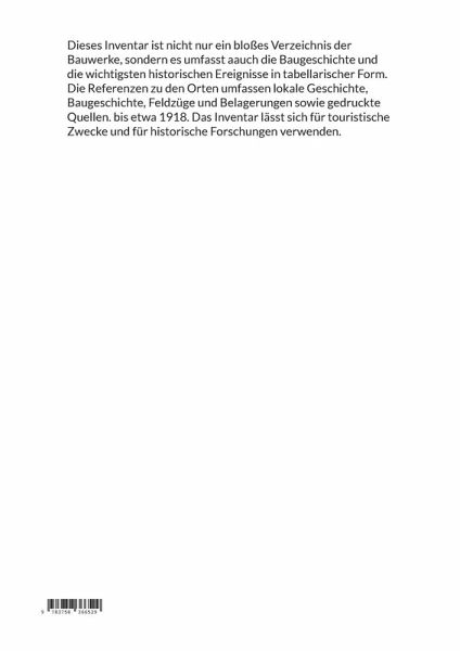 Dieses Inventar ist nicht nur ein bloßes Verzeichnis der Bauwerke, sondern es umfasst auch die Baugeschichte und die wichtigsten historischen Ereignisse in tabellarischer Form. Die Referenzen zu den Orten umfassen lokale Geschichte, Baugeschichte, Feldzüge und Belagerungen sowie gedruckte Quellen. bis etwa 1918. Das Inventar lässt sich für touristische Zwecke und für historische Forschungen verwenden.