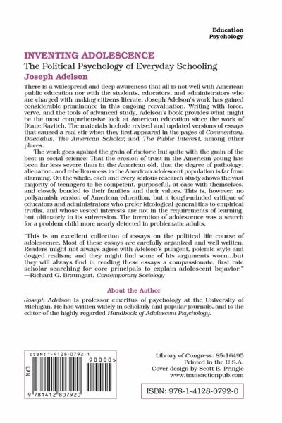 There is a widespread and deep awareness that all is not well with American public education nor with the students, educators, and administrators who are charged with making citizens literate. Joseph Adelson's work has gained considerable prominence in this ongoing reevaluation. Writing with force, verve, and the tools of advanced study, Adelson's book provides what might be the most comprehensive look at American education since the work of Diane Ravitch. The materials include revised and updated versions of essays that caused a real stir when they first appeared in the pages of Commentary, Daedalus, The American Scholar, and The Public Interest, among other places. The work goes against the grain of rhetoric but quite with the grain of the best in social science: That the erosion of trust in the American young has been far less severe than in the American old, that the degree of pathology, alienation, and rebelliousness in the American adolescent population is far from alarming. On the whole, each and every serious research study shows the vast majority of teenagers to be competent, purposeful, at ease with themselves, and closely bonded to their families and their values. This is, however, no pollyannish version of American education, but a tough-minded critique of educators and administrators who prefer ideological generalities to empirical truths, and whose vested interests are not in the requirements of learning, but ultimately in its subversion. The invention of adolescence was a search for a problem child more nearly detected in problematic adults.