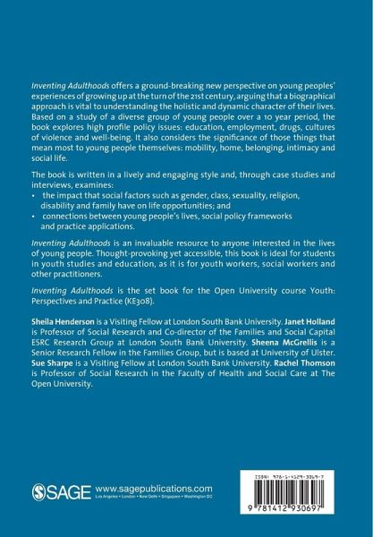 The series Youth: Perspectives and Practice provides a distinctive and rare combination of expert commentary, new research, original theorising and critical reflection on how we should understand youth and work with young people. These books deserve a wide readership ... the way they are written and organised will make them particularly appealing to students' - Professor Robert MacDonald, University of Teesside Inventing Adulthoods offers a ground-breaking new perspective on young peoples' experiences of growing up at the turn of the 21st century, arguing that a biographical approach is vital to understanding the holistic and dynamic character of their lives. Based on a study of a diverse group of young people over a 10 year period, the book explores high profile policy issues: education, employment, drugs, cultures of violence and well-being. It also considers the significance of those things that mean most to young people themselves: mobility, home, belonging, intimacy and social life. The book is written in a lively and engaging style and, through case studies and interviews, examines: "" the impact that social factors such as gender, class, sexuality, religion, disability and family have on life opportunities; and "" connections between young people's lives, social policy frameworks and practice applications. Inventing Adulthoods is an invaluable resource to anyone interested in the lives of young people. Thought-provoking yet accessible, this book is ideal for students in youth studies and education, as it is for youth workers, social workers and other practitioners. Inventing Adulthoods is the set book for the Open University course Youth: Perspectives and Practice (KE308). Sheila Henderson is a Visiting Fellow at London South Bank University. Janet Holland is Professor of Social Research and Co-director of the Families and Social Capital ESRC Research Group at London South Bank University. Sheena McGrellis is a Senior Research Fellow in the Families Group, but is based at University of Ulster. Sue Sharpe is a Visiting Fellow at London South Bank University. Rachel Thomson is Professor of Social Research in the Faculty of Health and Social Care at The Open University.
