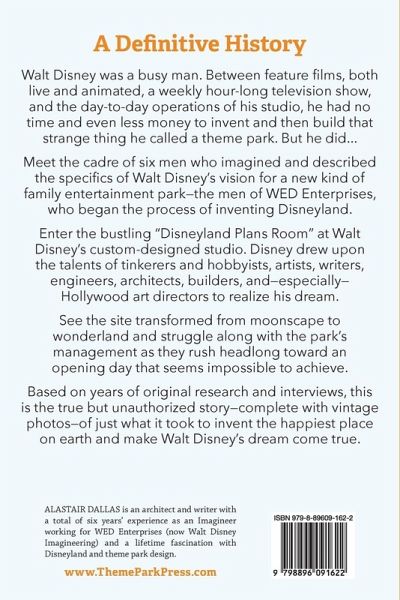 A Definitive History Walt Disney was a busy man. Between feature films, both live and animated, a weekly hour-long television show, and the day-to-day operations of his studio, he had no time and even less money to invent and then build that strange thing he called a theme park. But he did... Meet the cadre of six men who imagined and described the specifics of Walt Disney's vision for a new kind of family entertainment park-the men of WED Enterprises, who began the process of inventing Disneyland. Enter the bustling "Disneyland Plans Room" at Walt Disney's custom-designed studio. Disney drew upon the talents of tinkerers and hobbyists, artists, writers, engineers, architects, builders, and-especially-Hollywood art directors to realize his dream. See the site transformed from moonscape to wonderland and struggle along with the park's management as they rush headlong toward an opening day that seems impossible to achieve. Based on years of original research and interviews, this is the true but unauthorized story-complete with vintage photos-of just what it took to invent the happiest place on earth and make Walt Disney's dream come true.