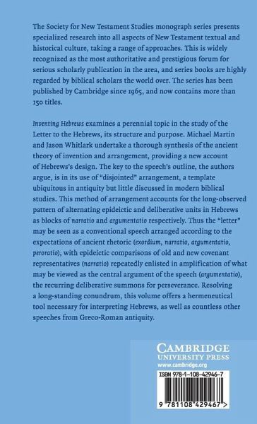 1. Structuring Hebrews: modern approaches to an ancient text; Part I. Laying the Foundation - Syncrisis in Hebrew: 2. Comparing covenants: the syncritical backbone of Hebrews; 3. Choosing the advantageous: deliberative syncrisis and epideictic syncrisis in Hebrews; Part II. Arranging the Speech - The Ancient Rhetorical Design of Hebrews: 4. Arranging an ancient speech: ancient compositional theory and a proposal for modern analysis; 5. Proving the case: argumentatio in Hebrews; 6. Presenting the facts relevant to the case: narratio in Hebrews; 7. Beginning with favor: exordium in Hebrews; 8. Ending with recapitulation and emotion: Peroratio in Hebrews; 9. Putting it all together: the rhetorical arrangement and aim of Hebrews; 10. Examining implications: Early Christian sermons and apostasy in Hebrews.