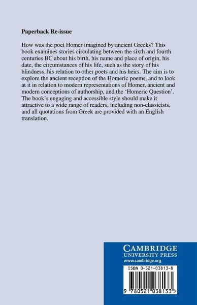 How was the poet Homer imagined by ancient Greeks? This book examines stories circulating between the sixth and fourth centuries BC about his birth, place of origin and name; the circumstances of his life - such as the story of his blindness - his relation to other poets, and his heirs. The aim is to explore the ancient reception of the Homeric poems, and to look at it in relation to modern representations of Homer, ancient and modern conceptions of authorship, and the 'Homeric Question'. The book's engaging and accessible style should make it attractive to a wide range of readers, including non-classicists, and all quotations from Greek are provided with an English translation.