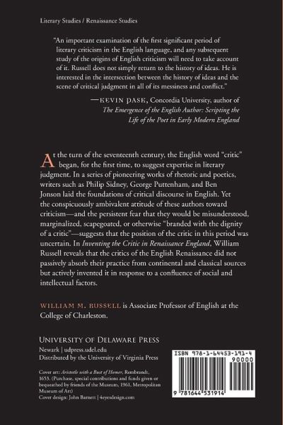 The turn of the seventeenth century was an important moment in the history of English criticism. In a series of pioneering works of rhetoric and poetics, writers such as Philip Sidney, George Puttenham, and Ben Jonson laid the foundations of critical discourse in English, and the English word "critic" began, for the first time, to suggest expertise in literary judgment. Yet the conspicuously ambivalent attitude of these critics toward criticism-and the persistent fear that they would be misunderstood, marginalized, scapegoated, or otherwise "branded with the dignity of a critic"-suggests that the position of the critic in this period was uncertain. In Inventing the Critic in Renaissance England, William Russell reveals that the critics of the English Renaissance did not passively absorb their practice from Continental and classical sources but actively invented it in response to a confluence of social and intellectual factors. Published by University of Delaware Press. Distributed worldwide by Rutgers University Press.