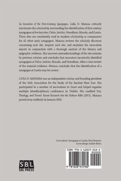 This work critically reevaluates the scholarship surrounding the identification of first-century synagogues at five key sites: Delos, Jericho, Herodium, Masada, and Gamla. These sites are consistently used in modern scholarship as comparators for all other early synagogues. Matassa reviews the scholarly discourse concerning each site, inspects each site, and thoroughly examines the excavation reports. Through close inspection of the material evidence she uncovers misunderstandings of the site remains and concludes that excavators incorrectly identified synagogues at Delos, Jericho, Masada, and Herodium. In the case of Gamla, however, the identification may be correct.