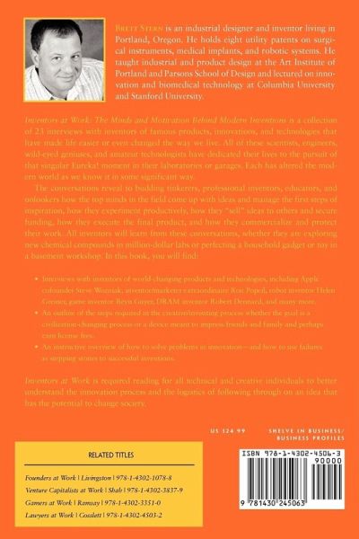 Inventors at Work: The Minds and Motivation Behind Modern Inventions is a collection of interviews with inventors of famous products, innovations, and technologies that have made life easier or even changed the way we live. All of these scientists, engineers, wild-eyed geniuses, and amateur technologists have dedicated their lives to the pursuit of that singular Eureka! moment in their laboratories or garages. Each has altered the modern world as we know it in some significant way.